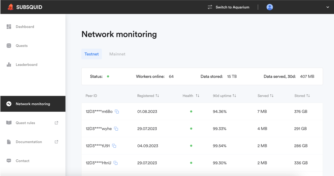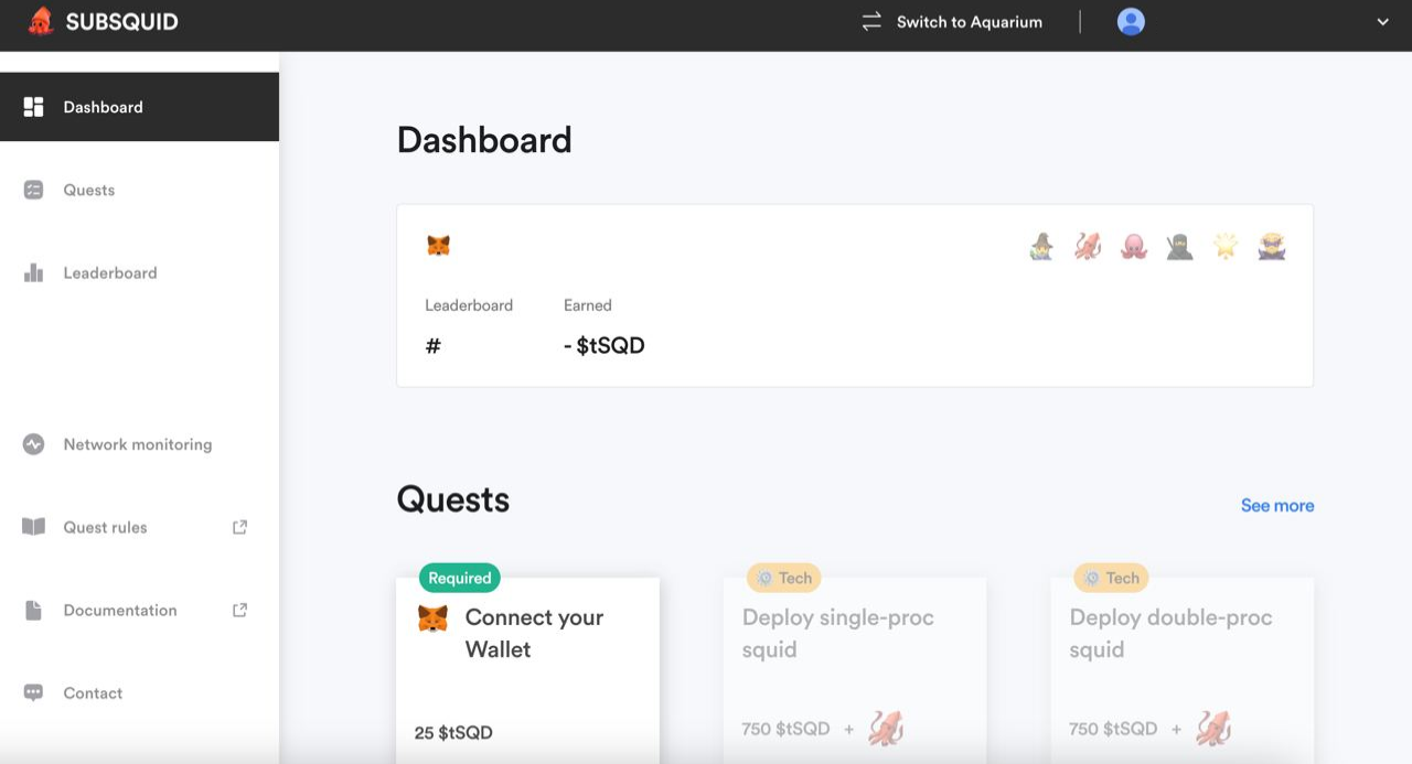 Your dashboard is your personal hub within the Subsquid Network. Here, you can keep track of your leaderboard rank, see the badges you've earned, check your tSQD balance, and discover upcoming quests. Consider it your mission control center, offering a snapshot of your journey in the Subsquid ecosystem.