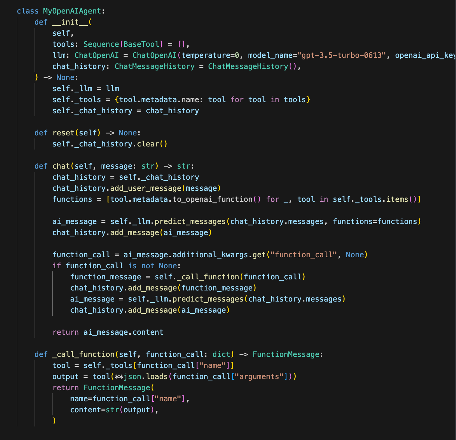 Now we are going to implement the tools for the agent to use. In this snippet, we define our agent that’s capable of holding a conversation and calling tools in under 50 lines of code. Source code can be found here.