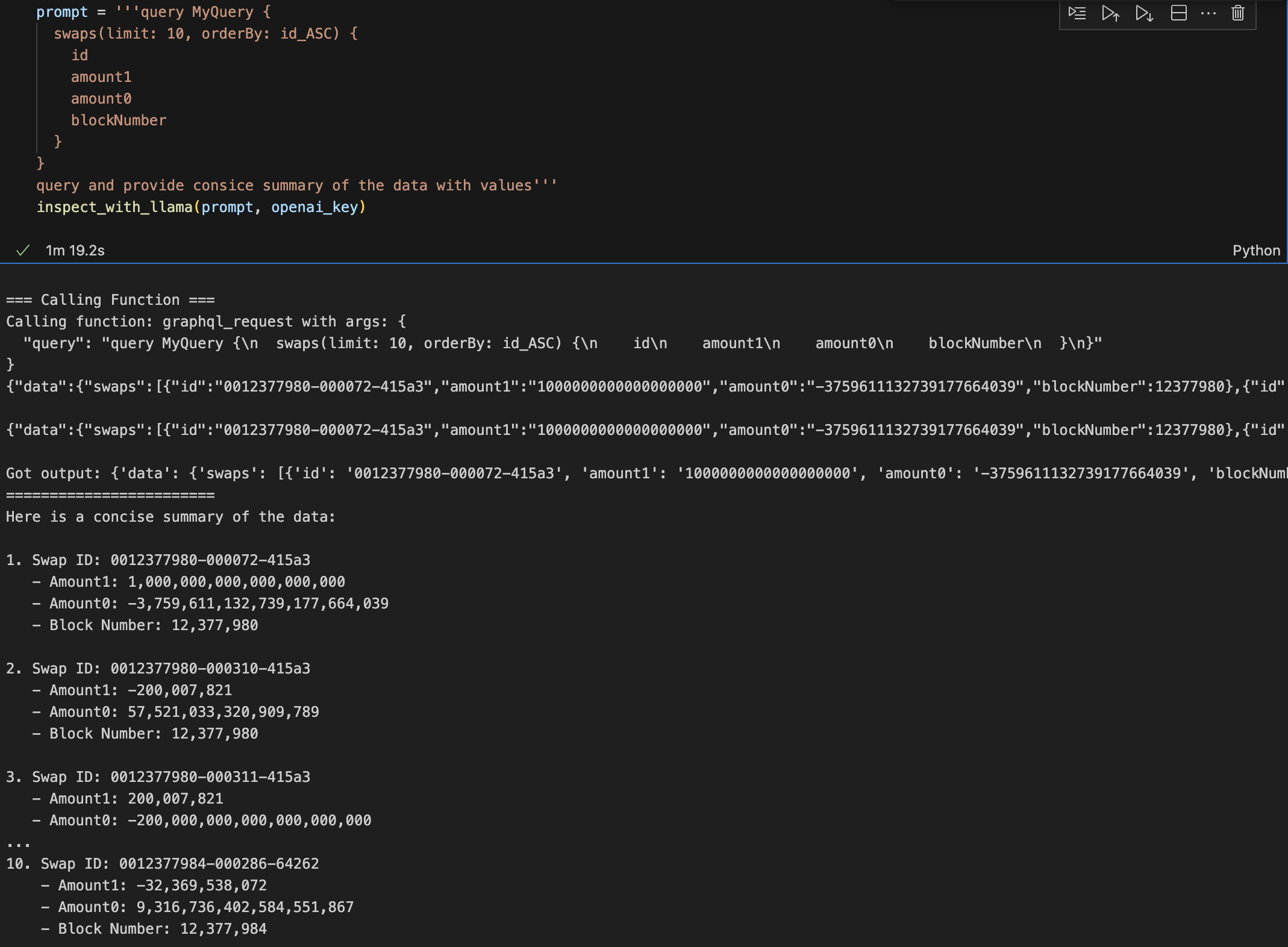 The queries can be structured, unstructured or both. Here’s the sample result of calling the agent on a squid, that indexes swap events on Uniswap.