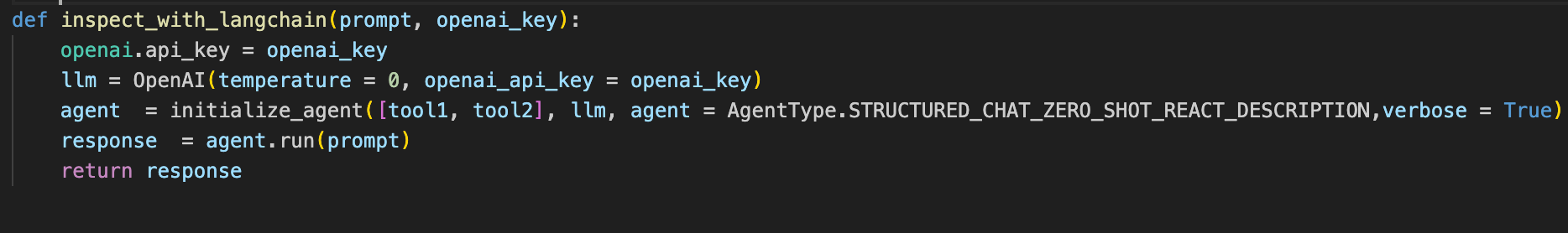 We can also integrate Langchain into the project. The workflow is similar and we can use the functions we implemented before to make tools for the agent.