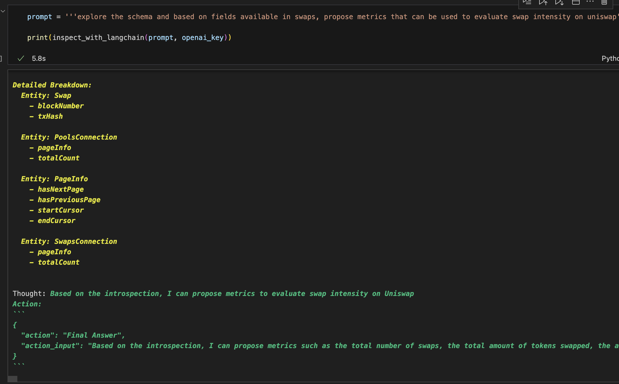 In this example, we use the LangChain agent to propose metrics for analysis of the swap events.